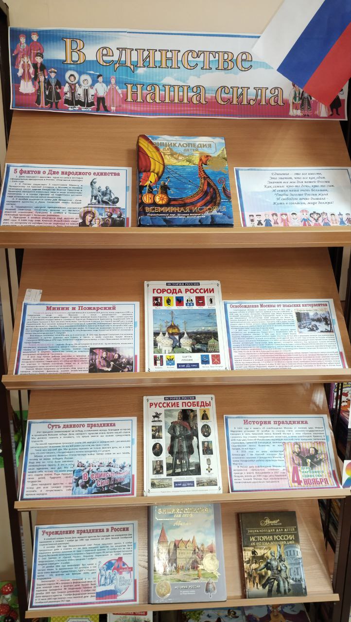 05 ноября Сегодня у нас прошло мероприятие – историческая игра-квест «Что ты знаешь о России?», посвященная дню народного единства. Цель мероприятия – патриотическое воспитание подрастающего поколения. Для его проведения в гости были приглашены ученики 4 класса Илькинской школы. Мы побеседовали со школьниками о празднике, его истории, затем посмотрели небольшой мультфильм о Минине и Пожарском, а затем начались этапы игры – дети расшифровывали пословицы о Родине, соотносили государственные праздники с датами, и, в завершение, разгадывали очень интересный кроссворд. Игра прошла активно и весело, никто не скучал. На память ребята получили буклеты «В единстве наша сила». Мероприятие сопровождалось выставкой.