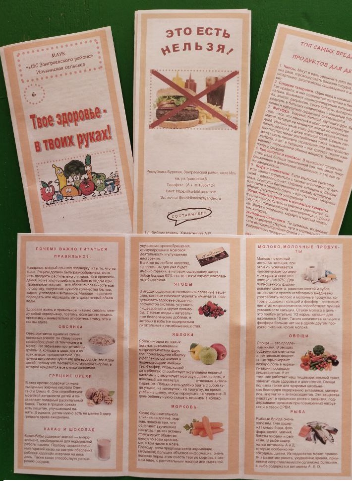 17 октября в Илькинской сельской библиотеке прошло мероприятие – информационный час «Питайся правильно». Цель мероприятия – формирование навыков здорового образа жизни. Для участия к нам были приглашены учащиеся 4 класса Илькинской СОШ. Ребята посмотрели мультфильм со Смешариками о роли хороших и плохих продуктов для организма человека, приняли участие в познавательной викторине, а затем выполнили задание – найти в списке продуктов три самых вредных и пояснить, почему они таковыми являются. В ходе мероприятия школьники получили много полезной информации, а также смогли продемонстрировать свои знания. В конце мероприятия каждый ученик получил буклет «Твое здоровье – в твоих руках».
