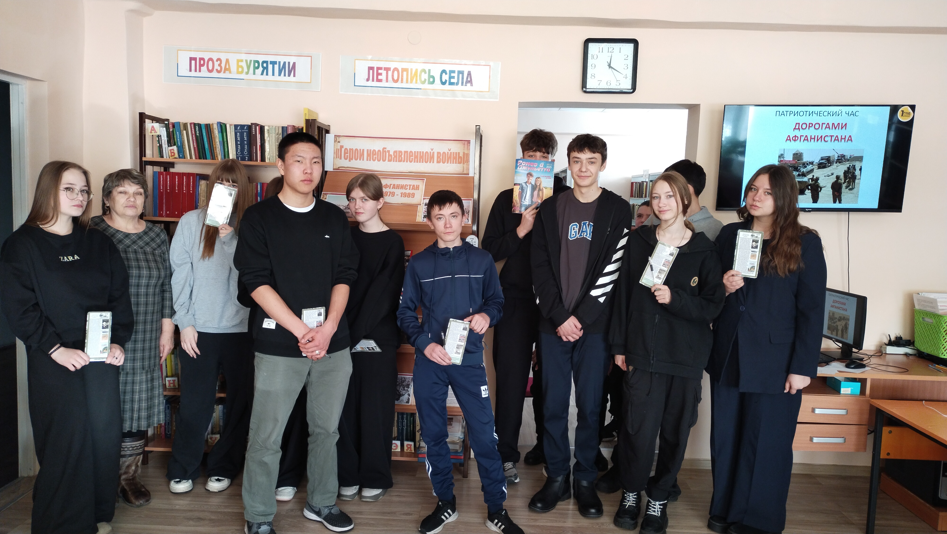 12 ФЕВРАЛЯ в Илькинской сельской библиотеке прошло мероприятие – патриотический час «Дорогами Афганистана». На него были приглашены ученики 9 класса Илькинской средней школы в количестве 18 человек и один педагог. В самом начале библиотекарем была проведена беседа об исторических событиях, происходивших во времена Советского Союза в период с 1979 по 1989 год, озвучены официальные данные о принявших участие и погибших в Афганской войне, выполнен обзор книги о воинах-афганцах из Бурятии. Затем школьники посмотрели документальный фильм о событиях в Афганистане, а после просмотра была проведена небольшая историческая викторина по теме мероприятия. Мероприятие сопровождалось выставкой «Герои необъявленной войны». Все участники получили небольшие призы и памятные закладки «Книги об Афганской войне».